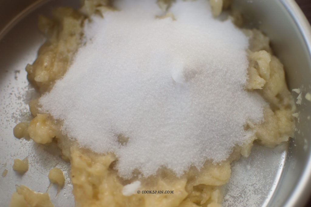 Banana Bread _Step 2 3. Add sugar to the mashed bananas, mix them well so that sugar dissolved well into bananas.