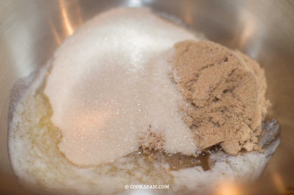 - Cream the butter, sugar mixture (white and brown) and Vanilla Extract using a electric mixer for 2-3 mins.