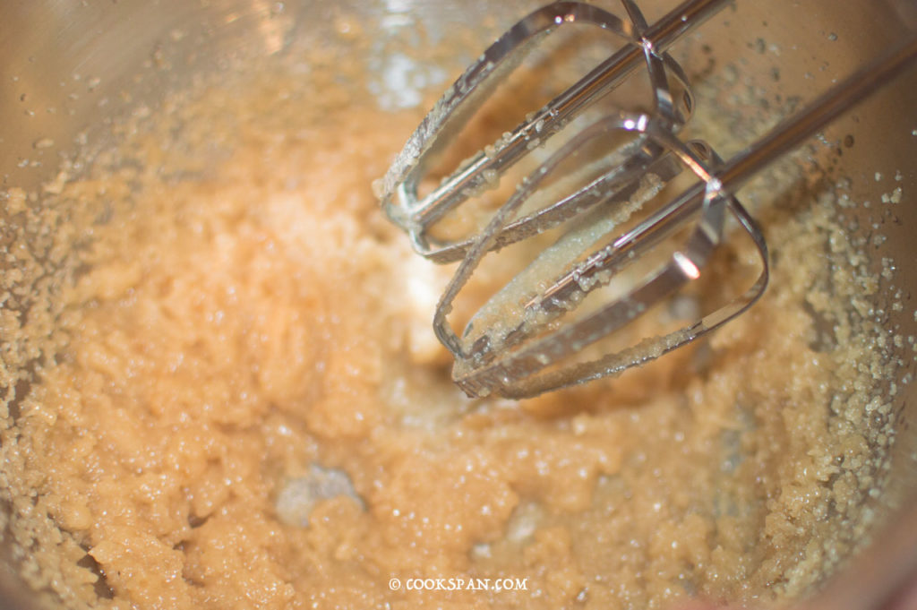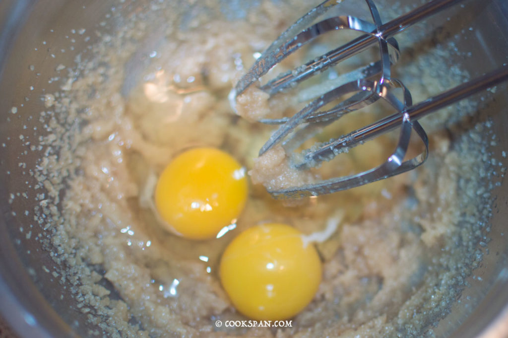 - Then add the eggs and beat it for 2 mins, until the mixture is nice and fluffy.