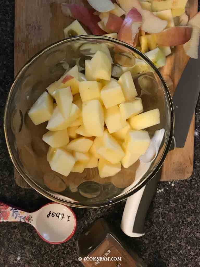 - Peel and chop the apples to medium sized cubes.