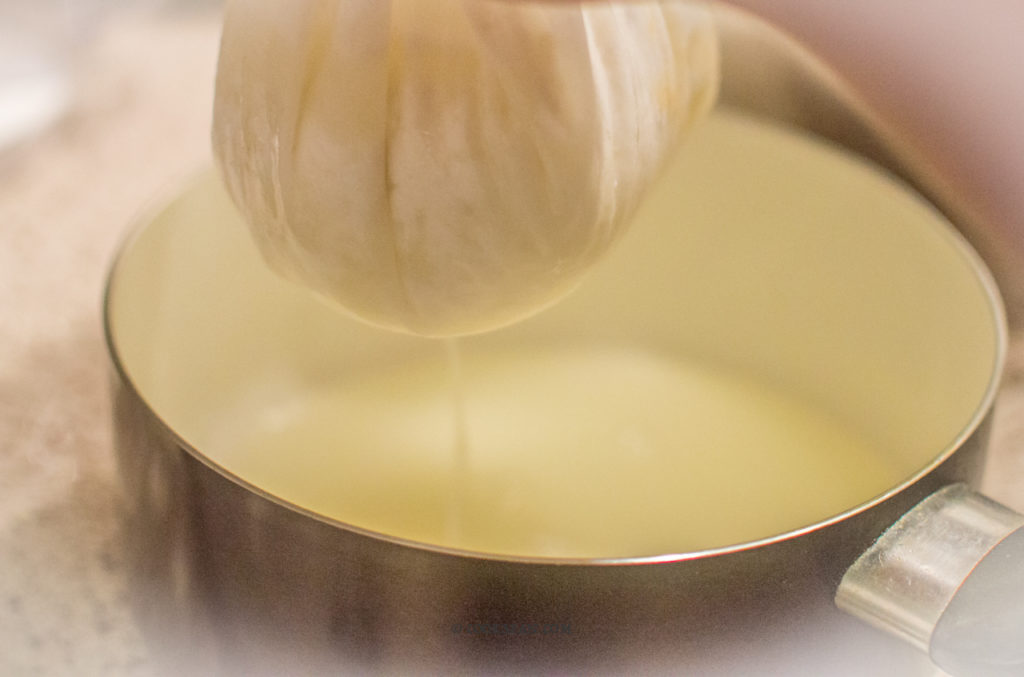Sandesh_Step_03 4. Drain out the excess water and strain the Chenna or Paneer in a clean white cloth or muslin cloth.