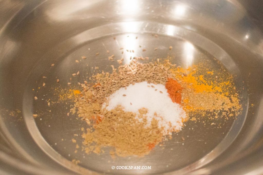 - In a large mixing bowl take all the spices (Cumin Powder, Carom seeds, Coriander Powder, Red Chili Powder, Turmeric Powder, Salt).