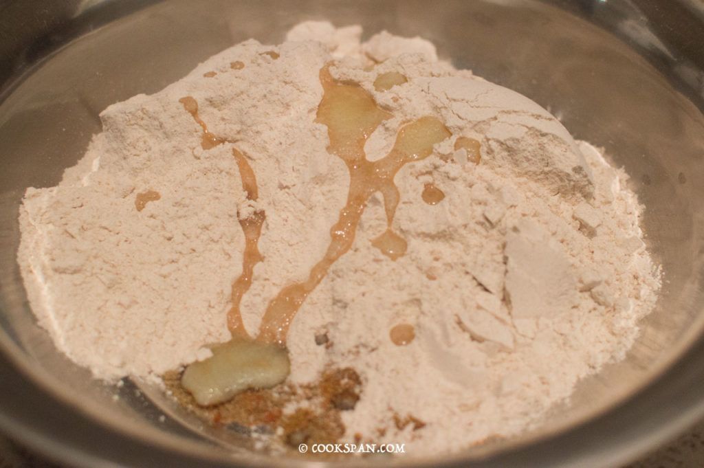 - Add the Whole Wheat Flour to the spices and add 2 tbsp of clarified butter or ghee.