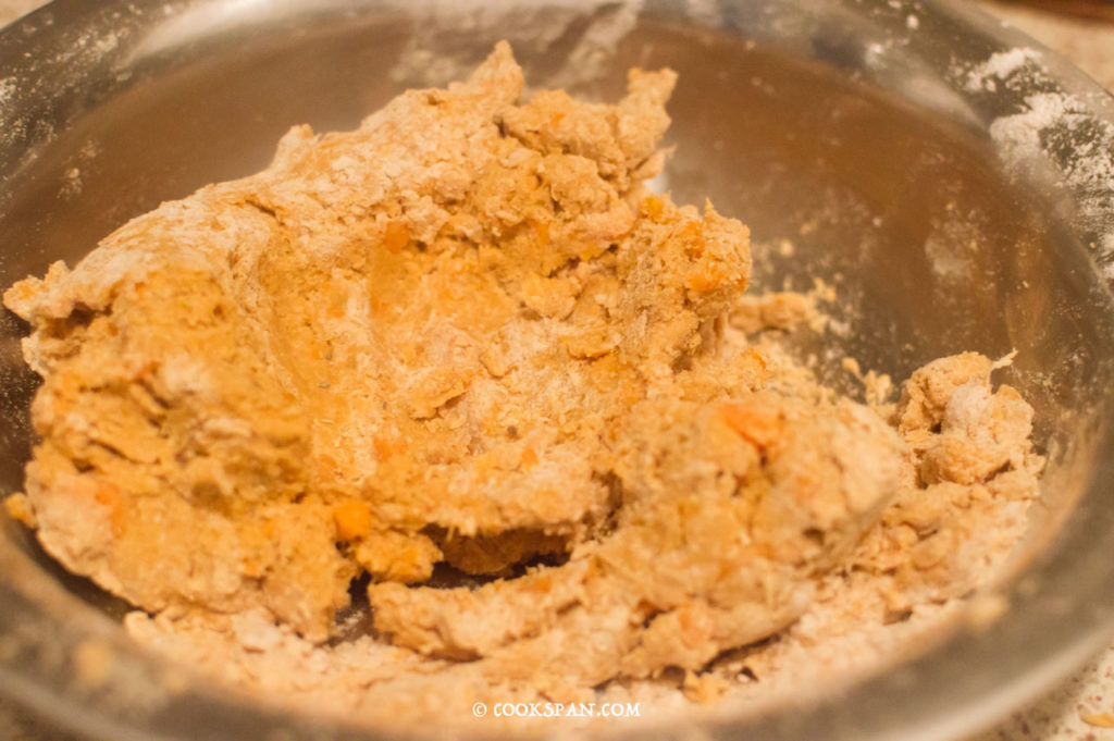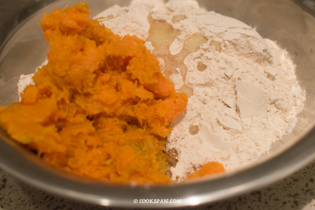 - To the Flour and spices add the mashed sweet potato.