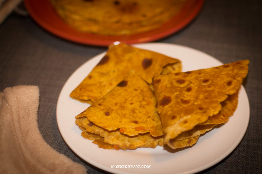 Sweet potatoes were never regular into the family menus until last year when the little one started taking solid food. It soon became his favorite along with carrots. But as he grew from a nicer infant to a terrible toddler, he got picky with lots of options and started ignoring the baked or boiled sweet potato pieces. However, upon experimentation, I’ve found his liking for Sweet Potato pancakes or Sweet Potato Paratha. This one is no onion no garlic recipe.