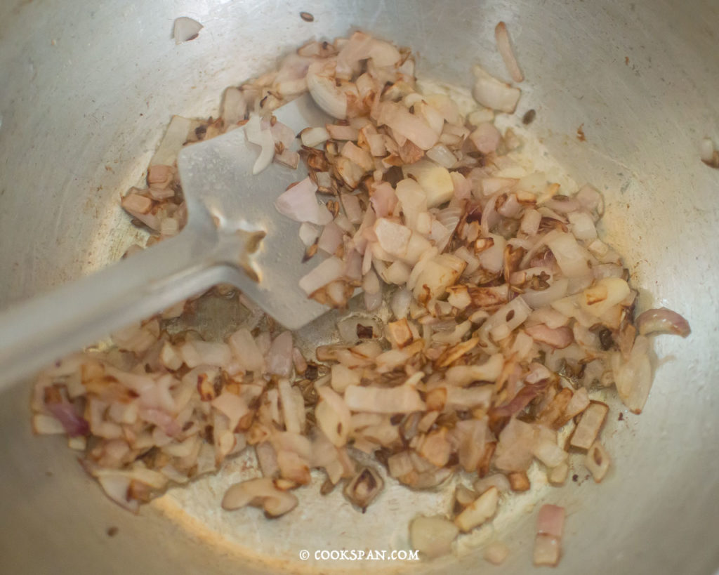- Saute the cumin seeds, then add the Onion and fry till its golden brown.