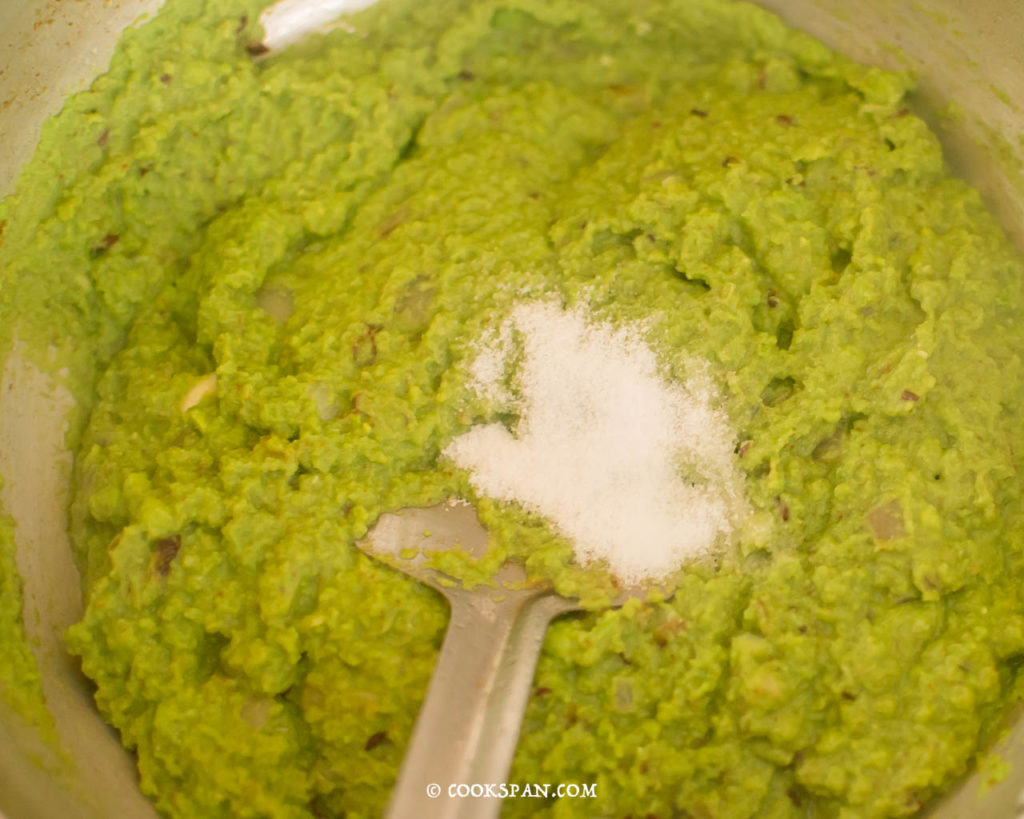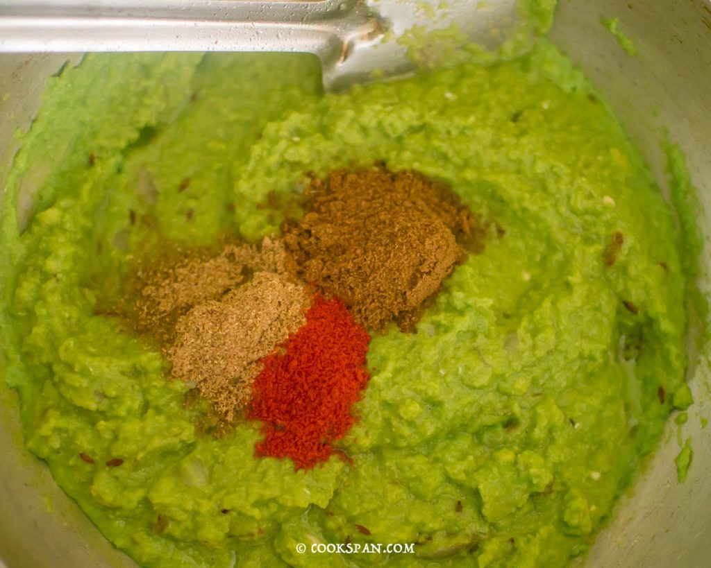 - In a mixer grinder, coarsely grind the Green Peas, garlic cloves, green chilies and ginger.