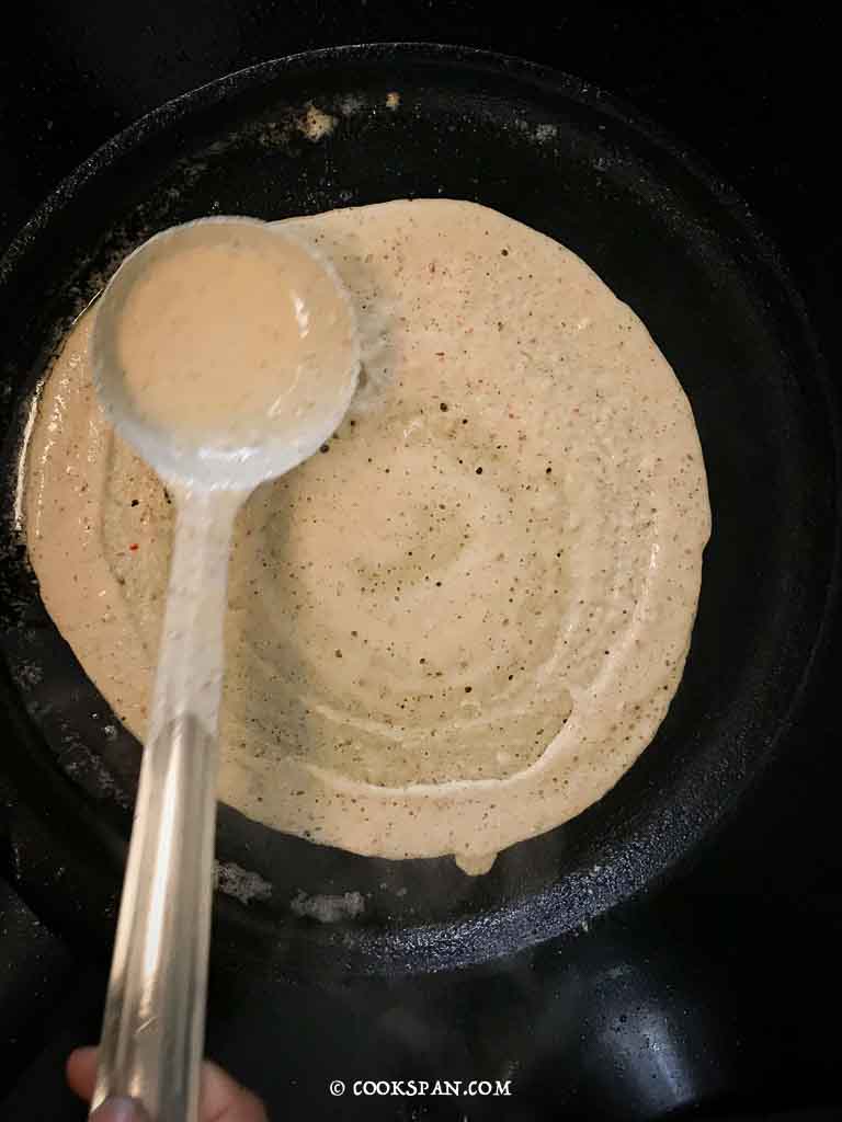 - Season, few drops of coconut oil on top of the spread batter and let it cook till golden brown on both sides.