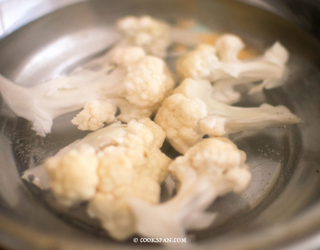 - In a wide bottomed vessel, boil the cauliflower florets and after it is cooked, let it cool to the normal temperature.