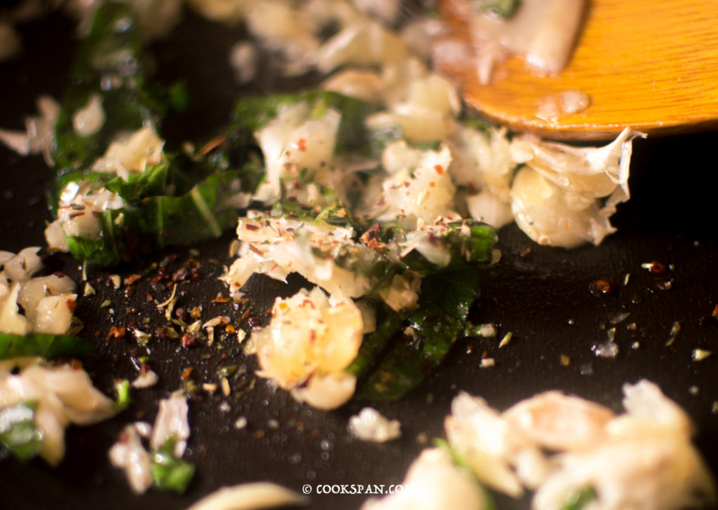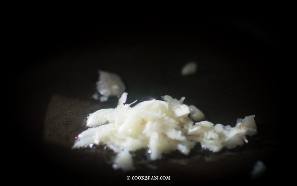 Stuffed Omelette with Spinach and Mushroom - Steps of Prep of Sauce 3. Heat a pan, add 2 tsp of Olive Oil. 4. Once the Oil is hot, add the minced garlic and saute it.