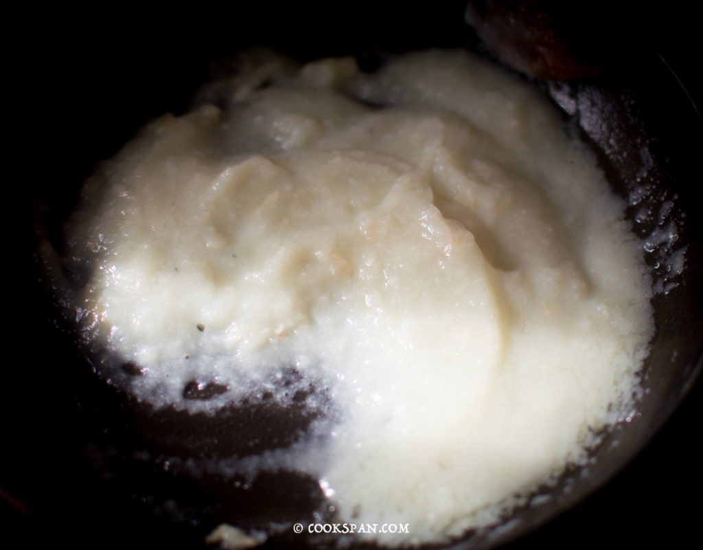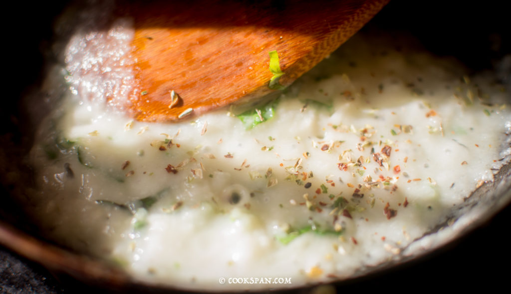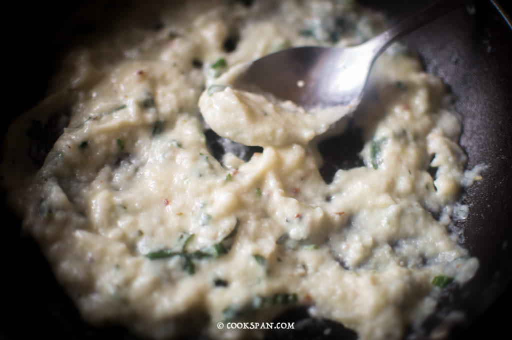 Stuffed Omelette with Spinach and Mushroom - Steps of Prep of Sauce 5. Allow the garlic flavor to get embedded in the oil. 6. Then add the pureed cauliflower and let it cook for 2-3 mins.