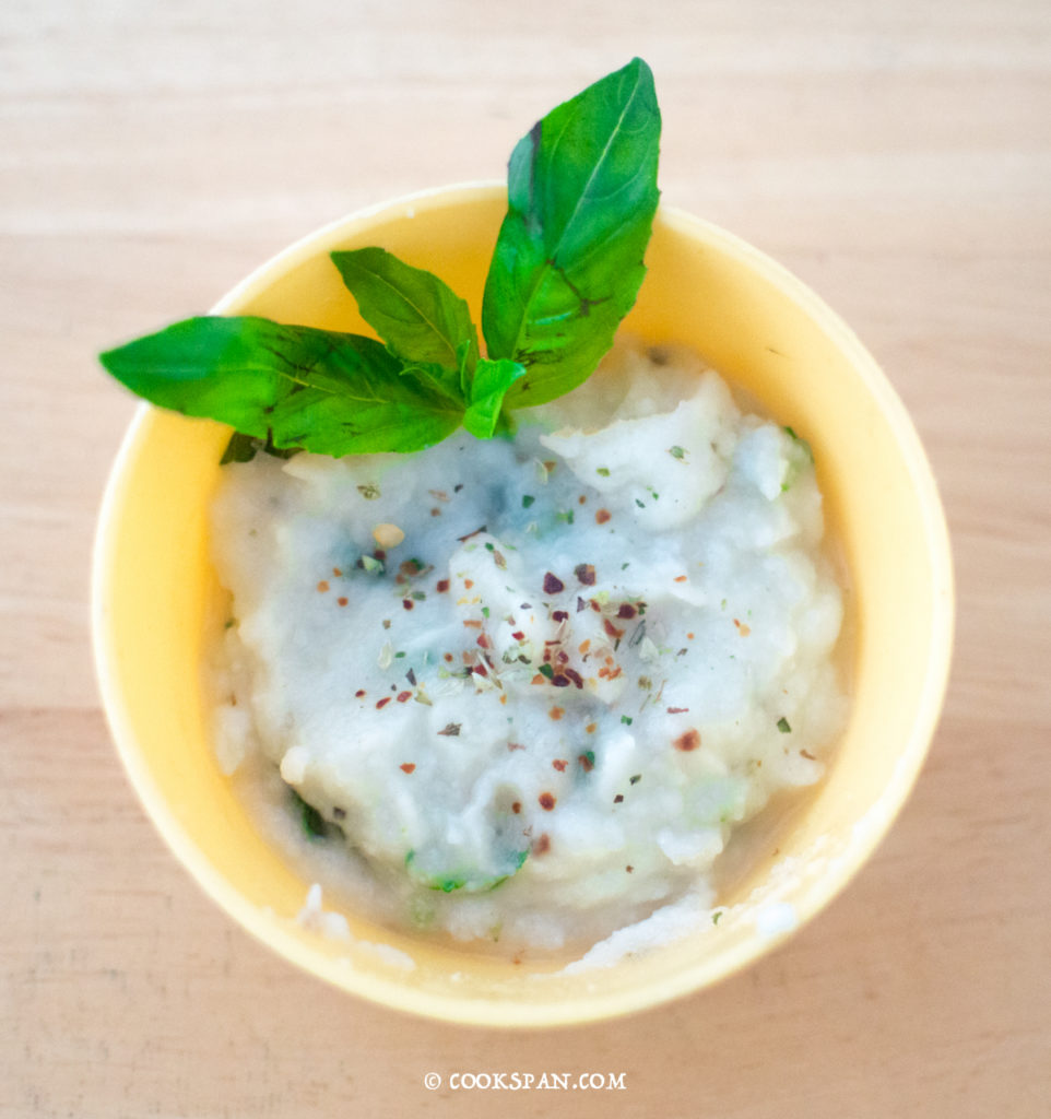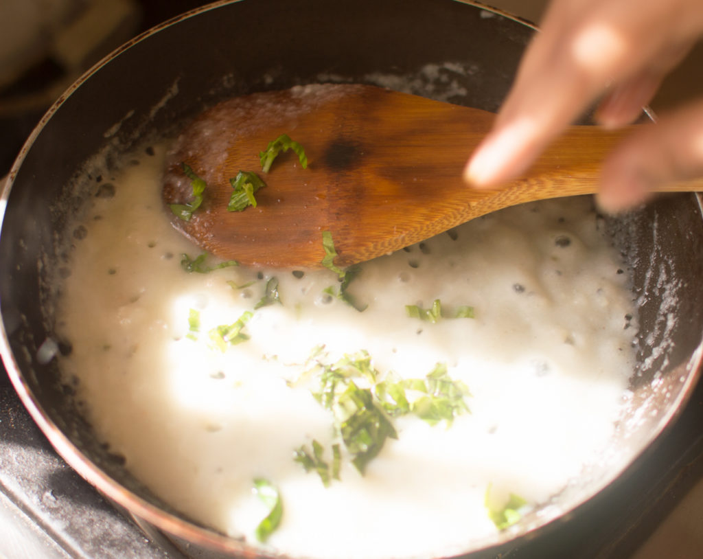 Stuffed Omelette with Spinach and Mushroom - Steps of Prep of Sauce 7. Once the cauliflower puree starts to simmer, add the chopped basil and some Italian seasoning or fresh oreganos.