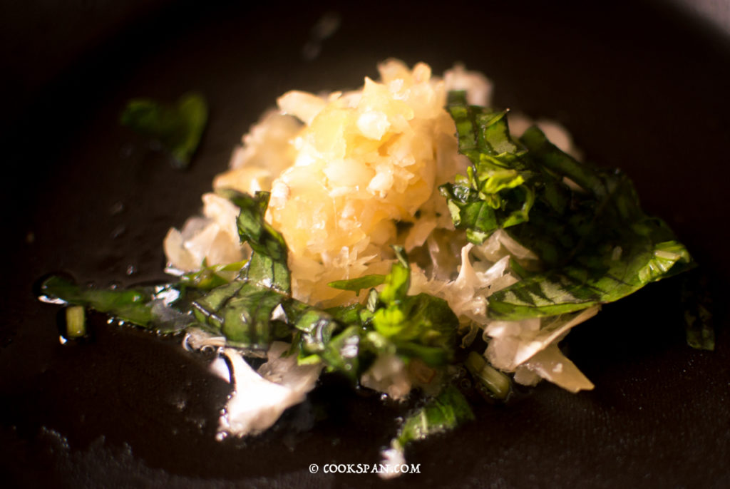 Stuffed Omelette with Spinach and Mushroom - Steps of Prep of Filling 5. After it is cooked, take it from the flame and keep it aside. 6. In the same pan, add 2tsp of Olive oil. 7. Add the minced garlic and finely chopped basil and saute it.