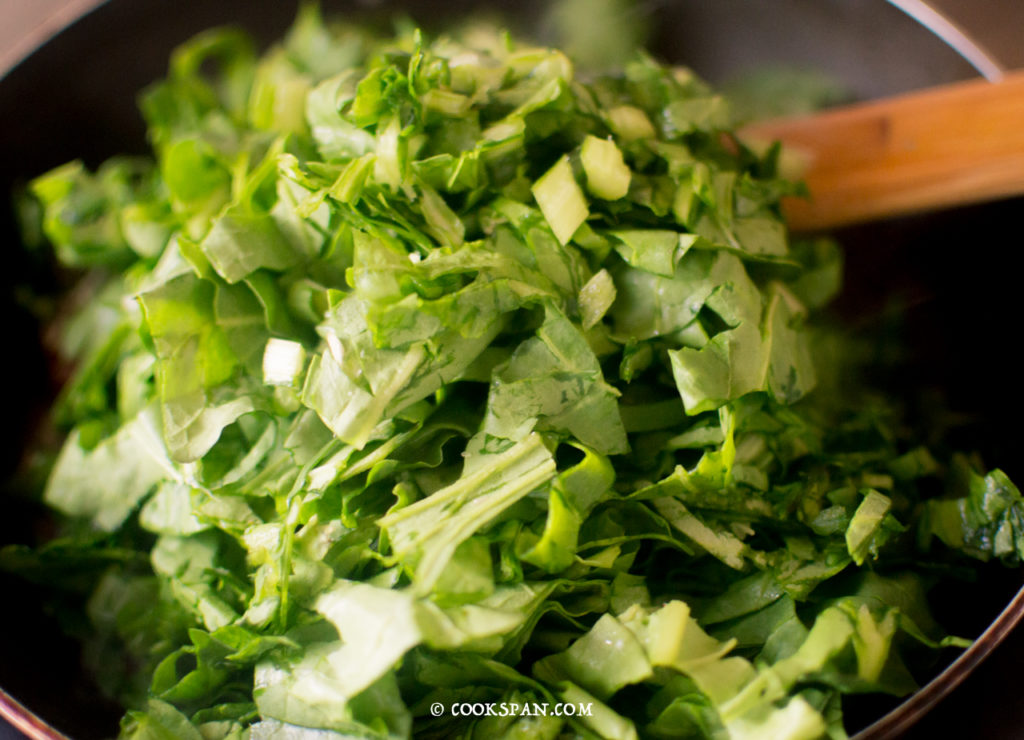 Stuffed Omelette with Spinach and Mushroom - Steps of Prep of Filling 9. To the flavorful seasoning, add the finely chopped spinach.