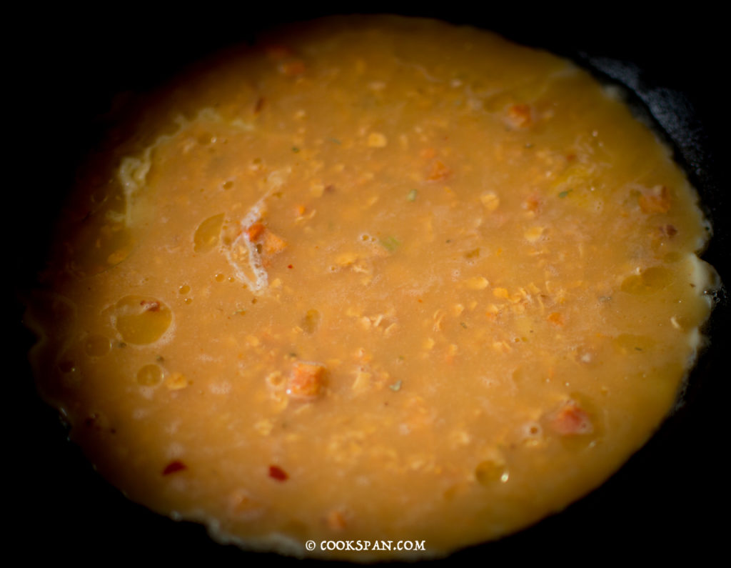 Stuffed Omelette with Spinach and Mushroom - Steps of Prep 2. Beat the eggs and oats together, season the batter with salt according to the taste. Don’t over do the salt as the filling already contains salt. 3. Heat a pan, add 1 tbsp of Olive Oil to it. Add half of the omelette patter to the pan and cook the Omelette. Once the side facing downwards is golden brown, flip the Omelette (if you prefer the raw version of eggs, you can stuff it now).