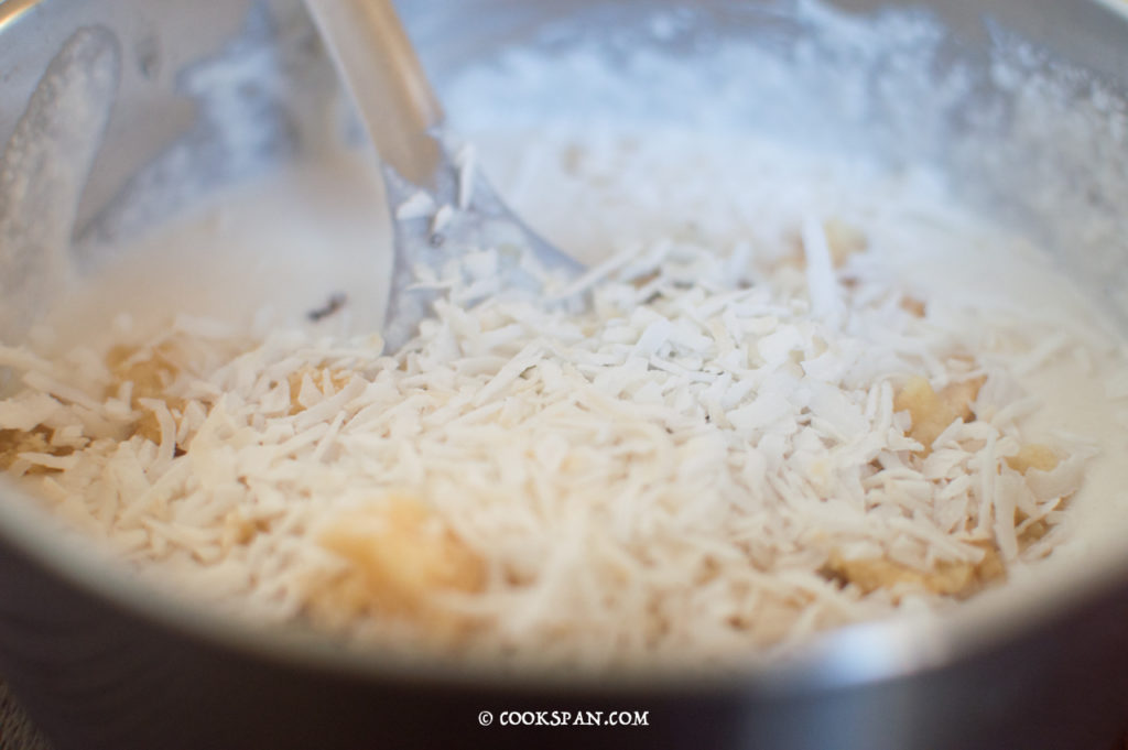 - Crush the Jaggery and add to the batter. Add salt and desiccated coconut too.