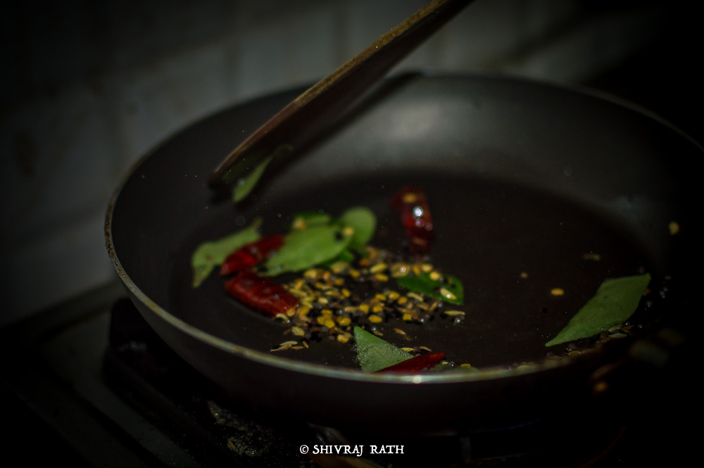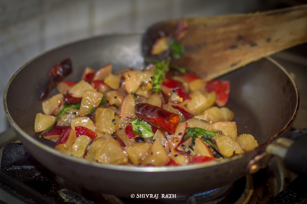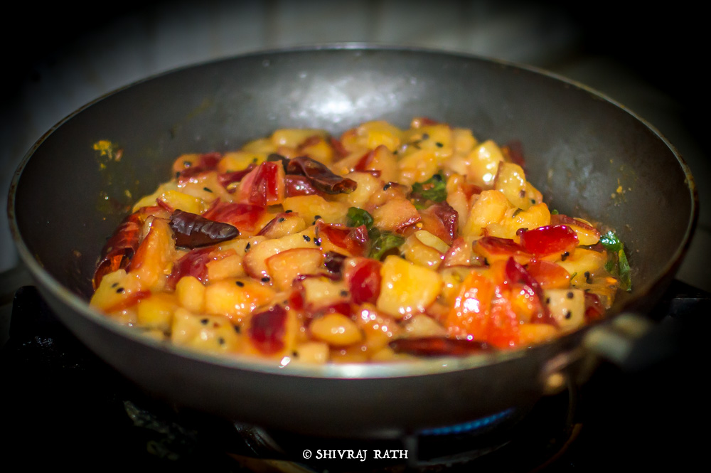 Plum cubes 3. Heat a pan, and add the Vegetable oil to it. 4. Once the oil is hot, add the Panch Phoron. If you don’t have the Panch Phoron you can add some Cumin seeds along with some fennel seeds. 5. Then add the red chilies and stir it for 1-2 mins adding curry leaves to the pan.