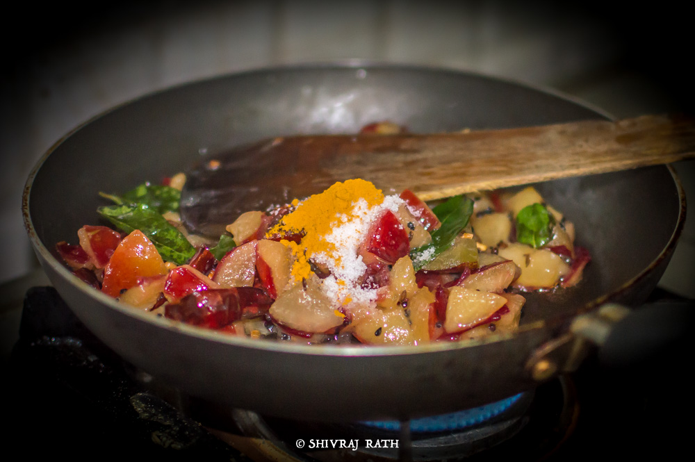 But honestly speaking, I didn’t recollect any form of plum. The closest I could guess were berries or grapes, thinking it to be sweet. But the ripe red color was deceptive, it has faint sweetness and was sour. Then an old faint memory of that chutney compelled me to call Mom and ask her how to cook for it. It was a very simple recipe, but was a true assortment to many dishes for the week long.