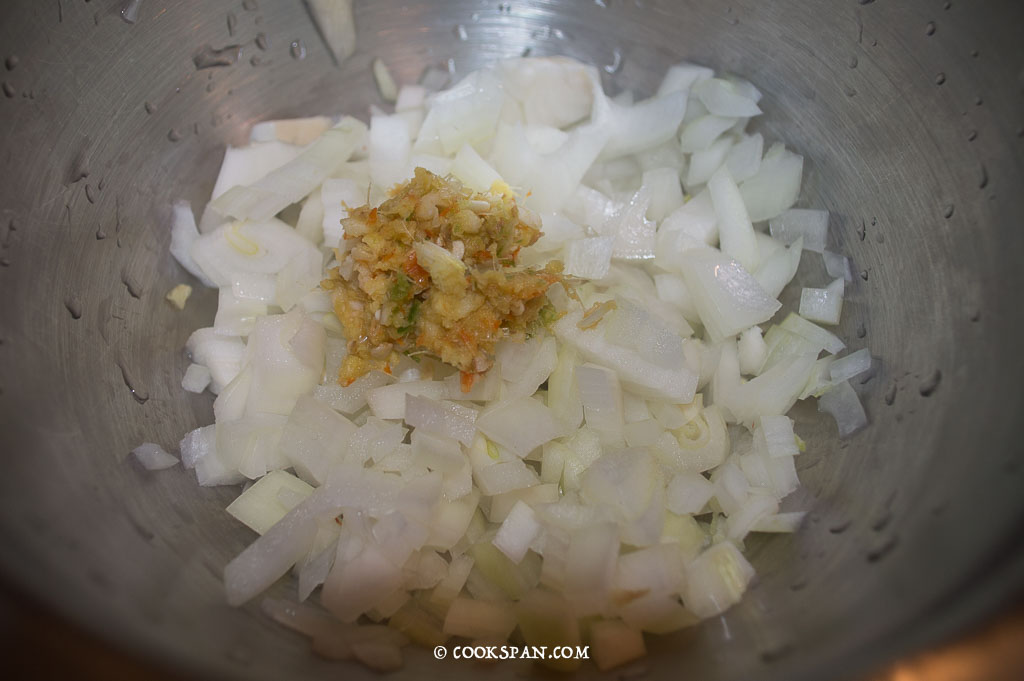 - The remaining chopped onions are added and fried till soft.