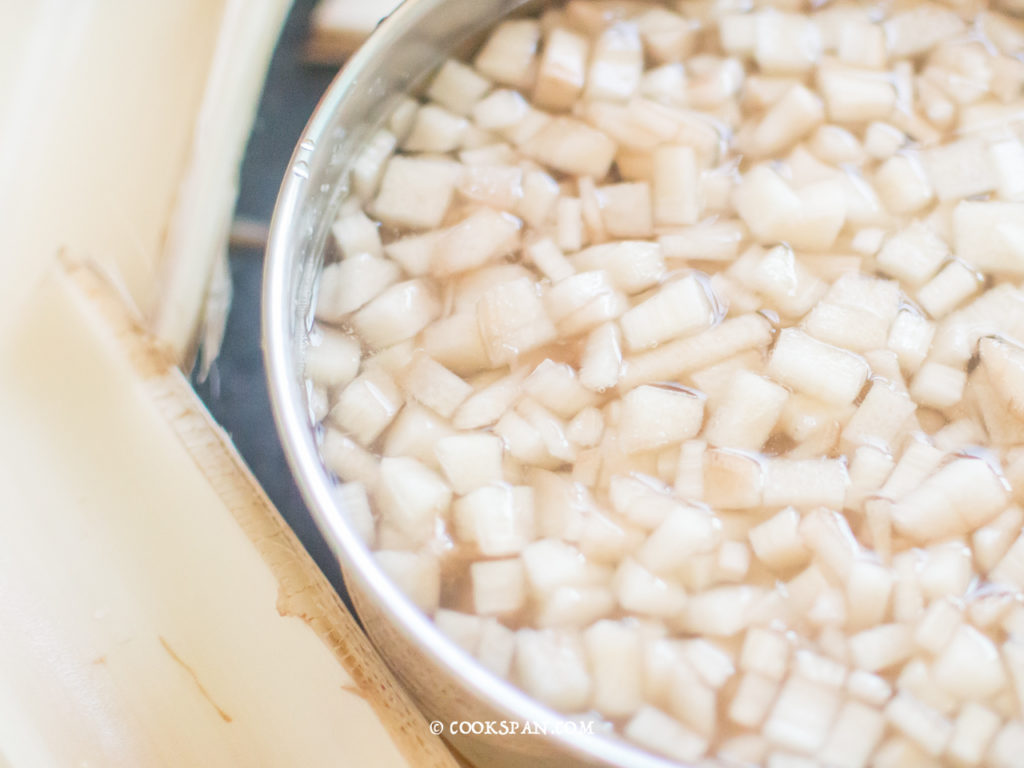 - Then cut the slices into small cubes and keep it soaked in water, else it would lead to browning or blackening of the banana stem cubes.