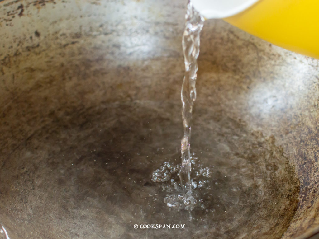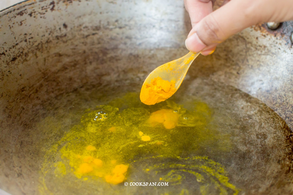 Adding the tempering to the Banana Stem Kadhi