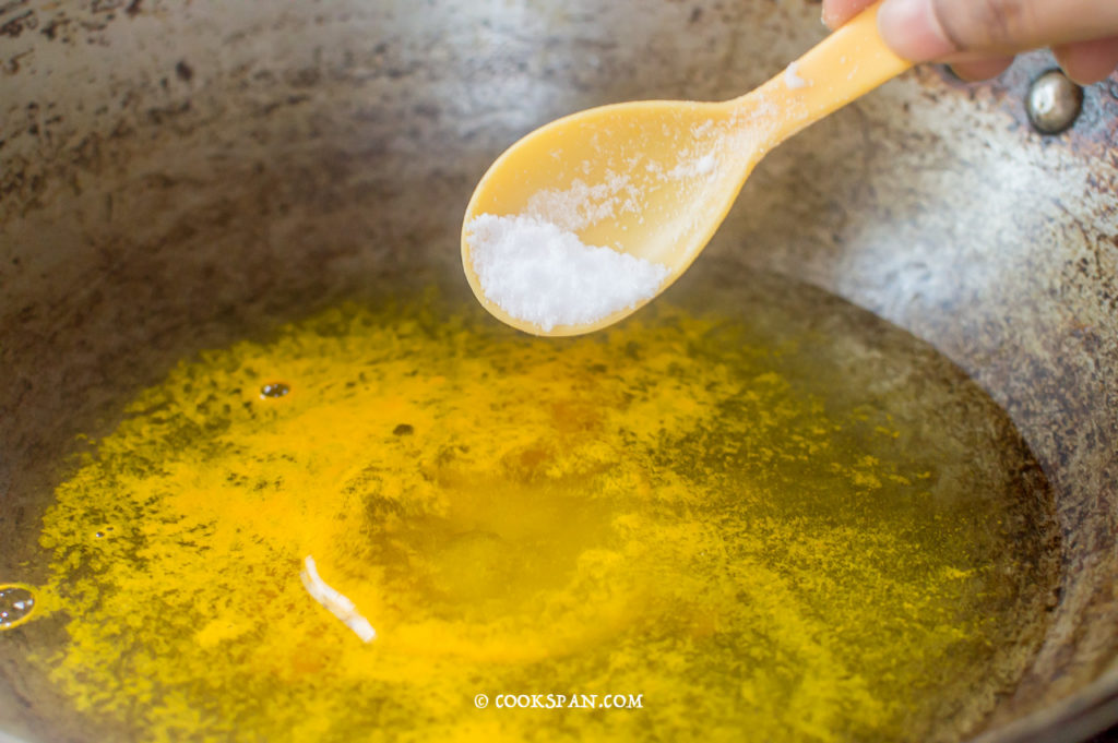- Heat the pan, once done, add 1 tbsp of mustard oil.