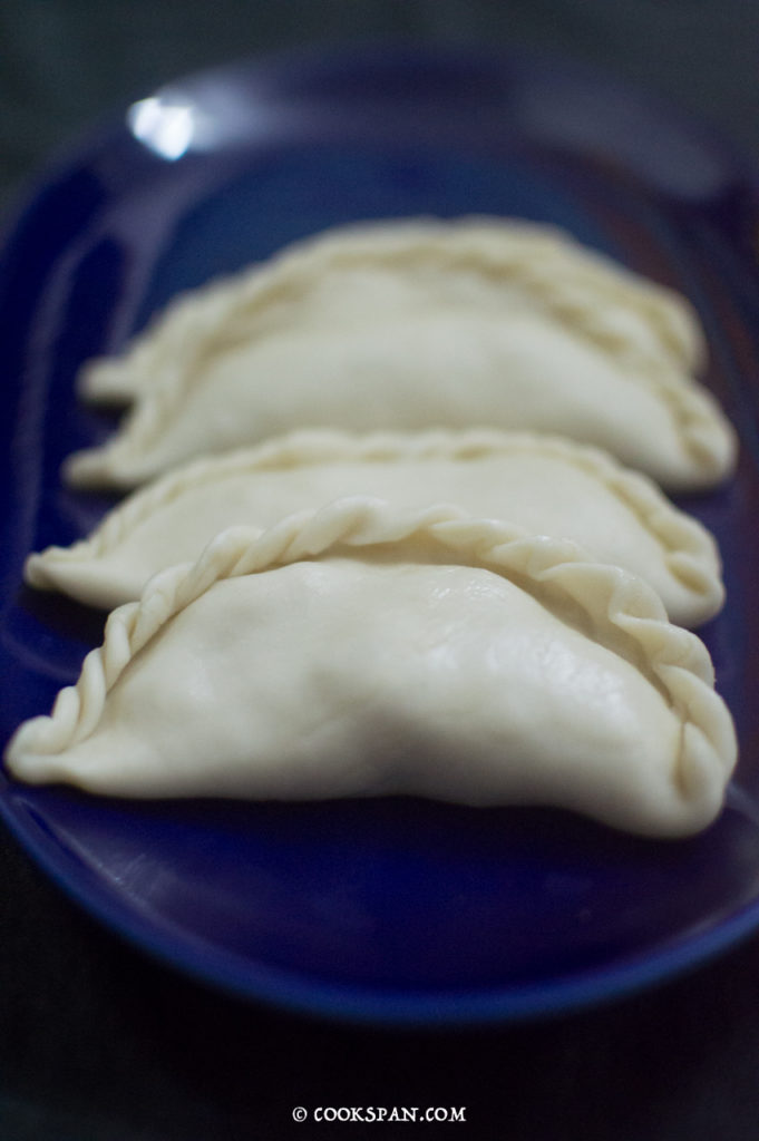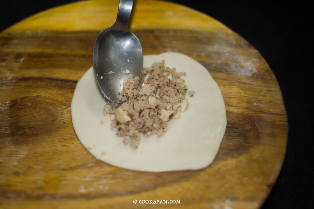 Here goes the recipe of coconut and cashew nut stuffed Gujiya or Empanada:
