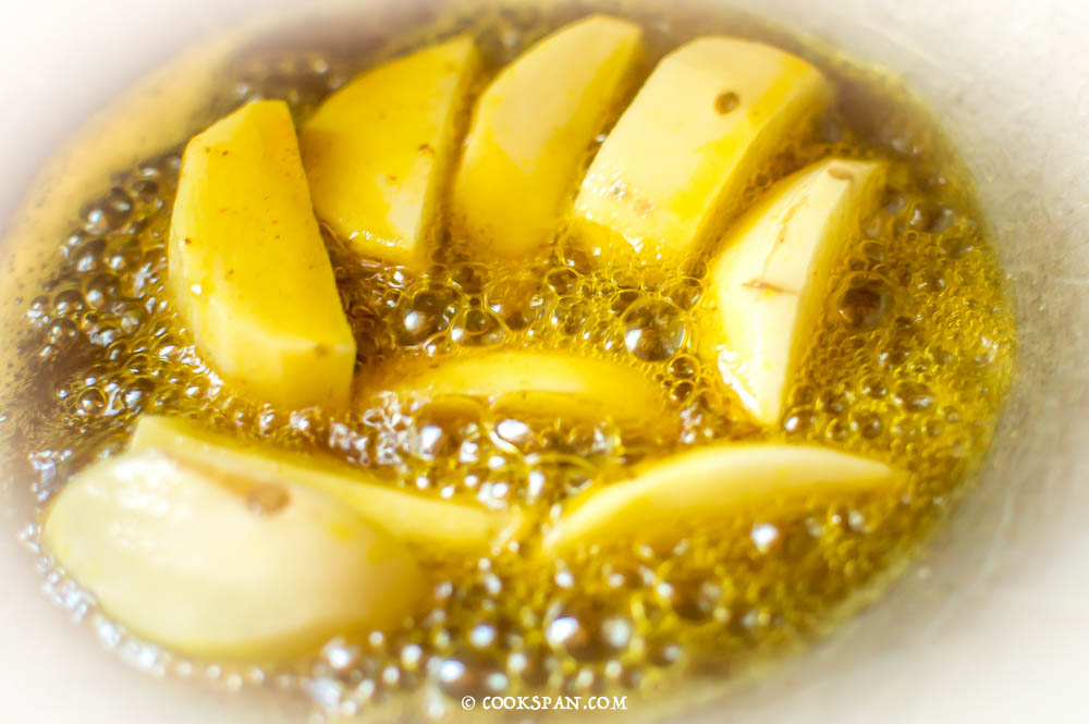 - Once the potatoes are cooked, check if there is enough oil to cook the gravy. If not, add 1 tbsp of oil.