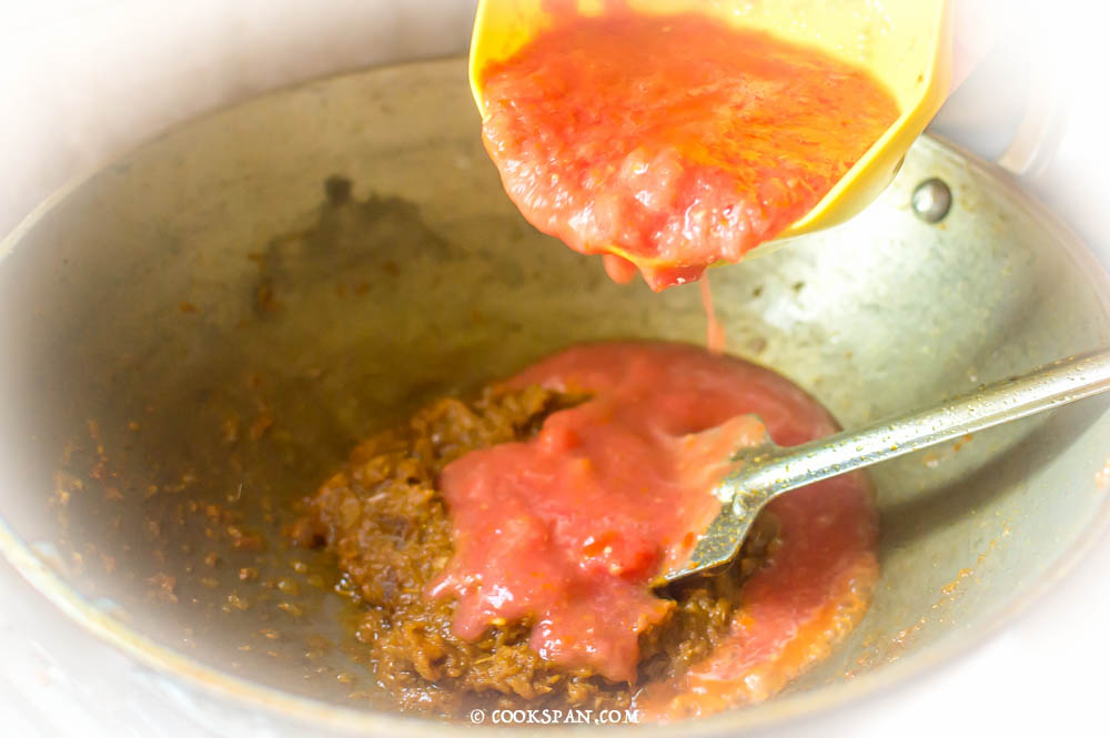 - After the masala is properly cooked and smell of raw ingredients are gone, add the tomato puree and cook for 2-3 mins till the oil oozes out.