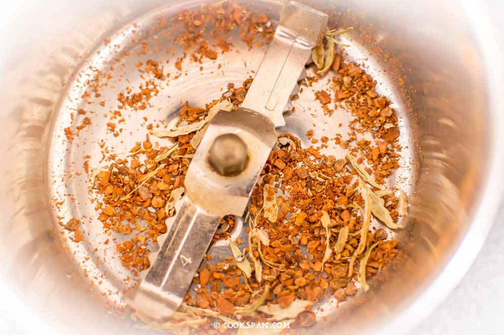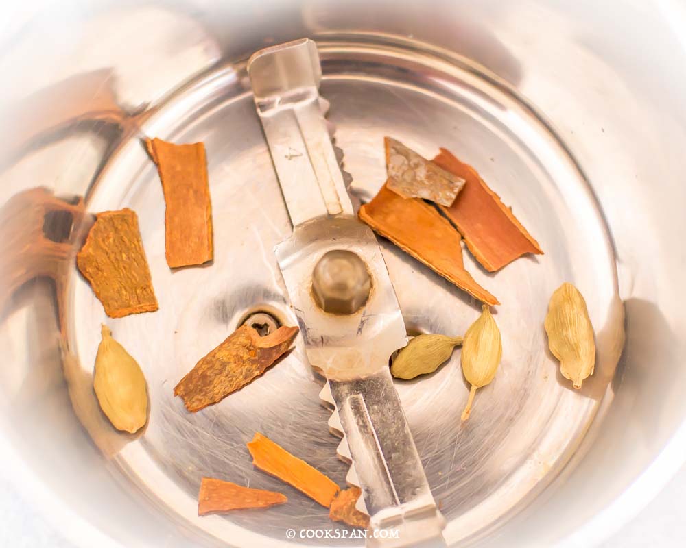 - Cinnamon or Dalchini: 1 stick, broken into pieces, and coarsely dry ground with Elaichi