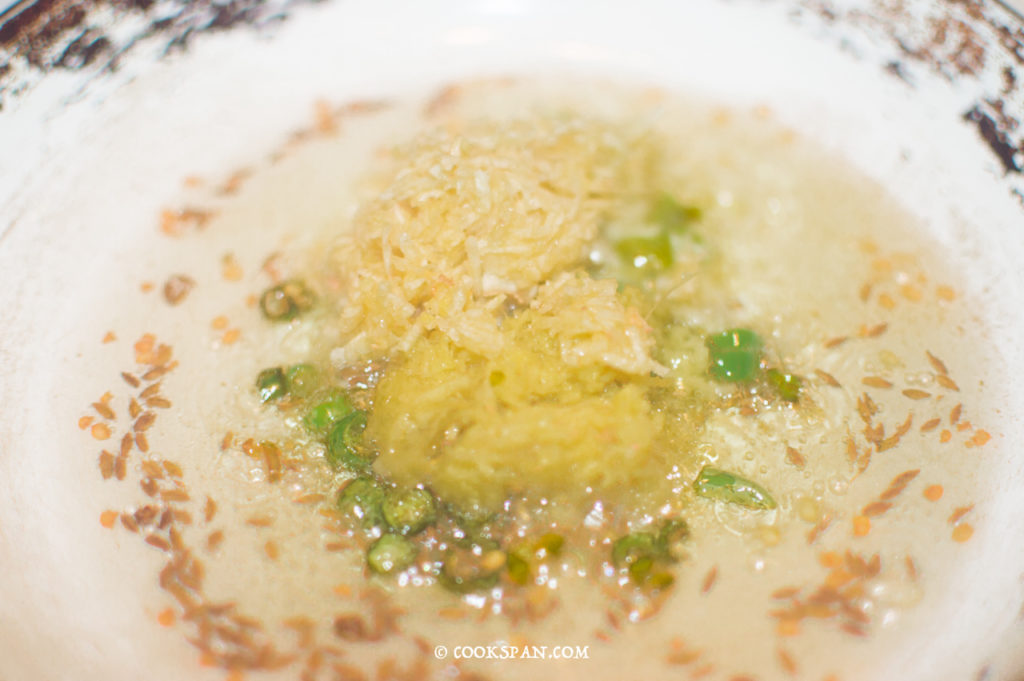 - To the mixture, add the grated ginger and grated garlic and saute it till the raw flavors goes away.