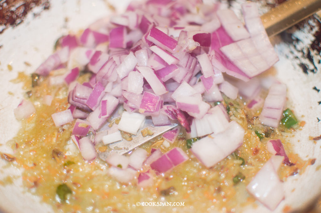 - Add the chopped onion and cook it till it turns golden.