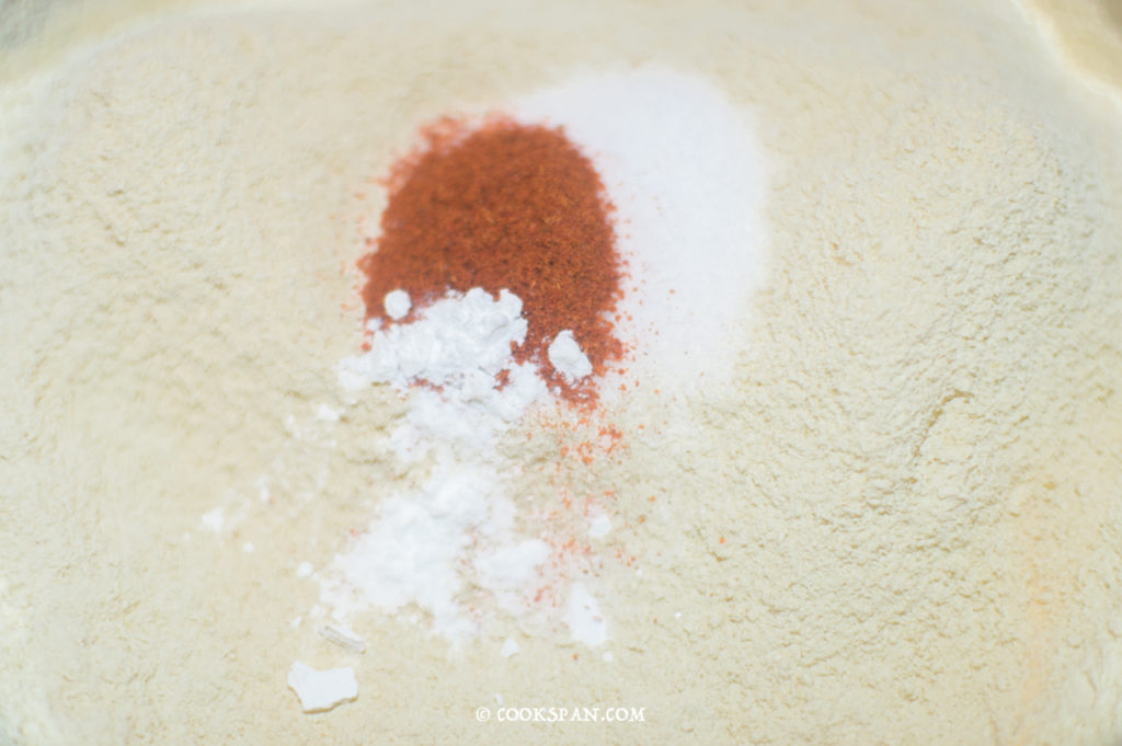 - Add the rest dry ingredients i.e. Baking soda, salt and Red chili powder.