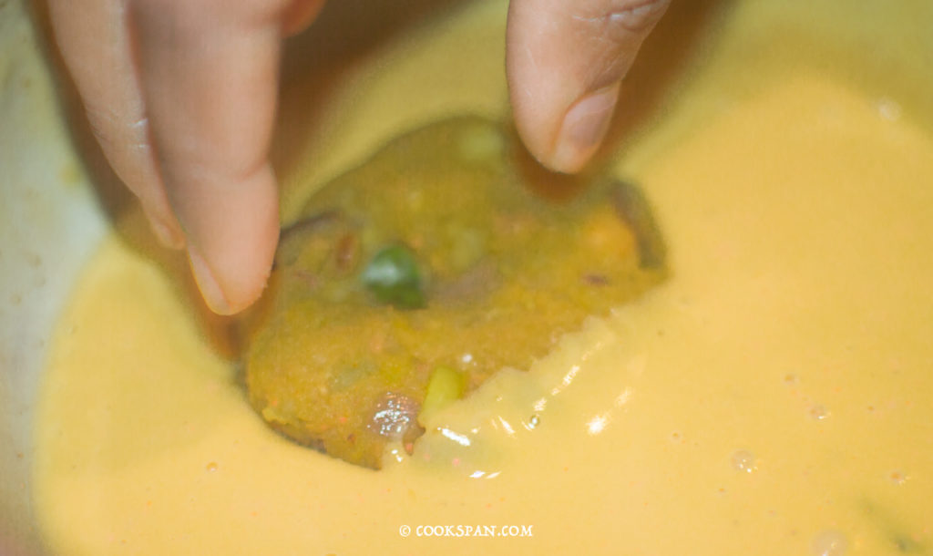 - Dip the potato discs into the chickpea batter and let it, deep fry till golden brown on both sides.