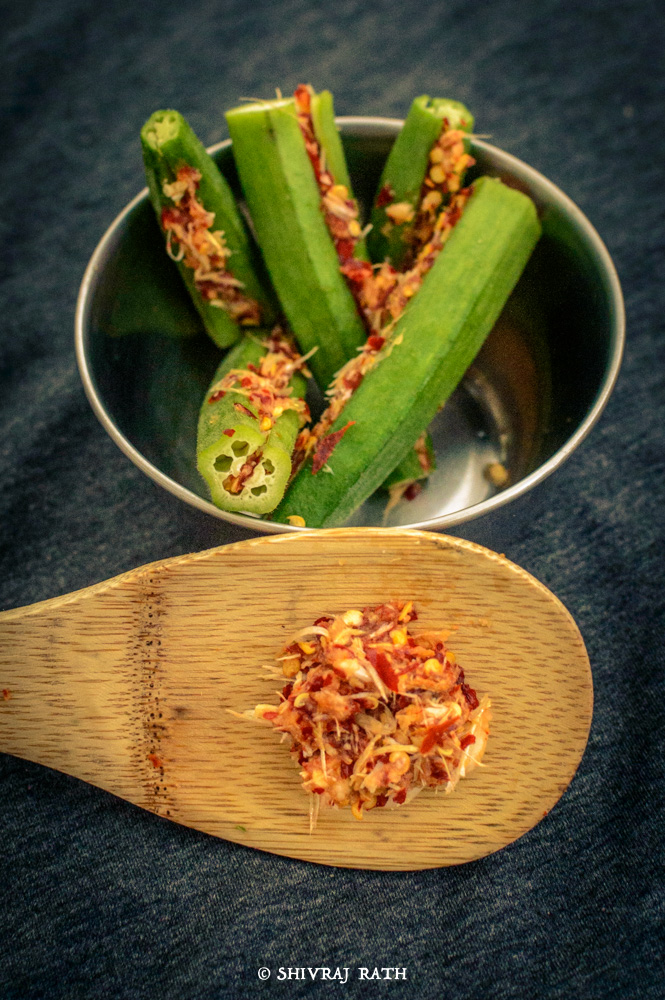 The recipe for Bharwan Bhindi/ Gotta Bhendi / Okra stuffed with Chili Garlic goes like this: