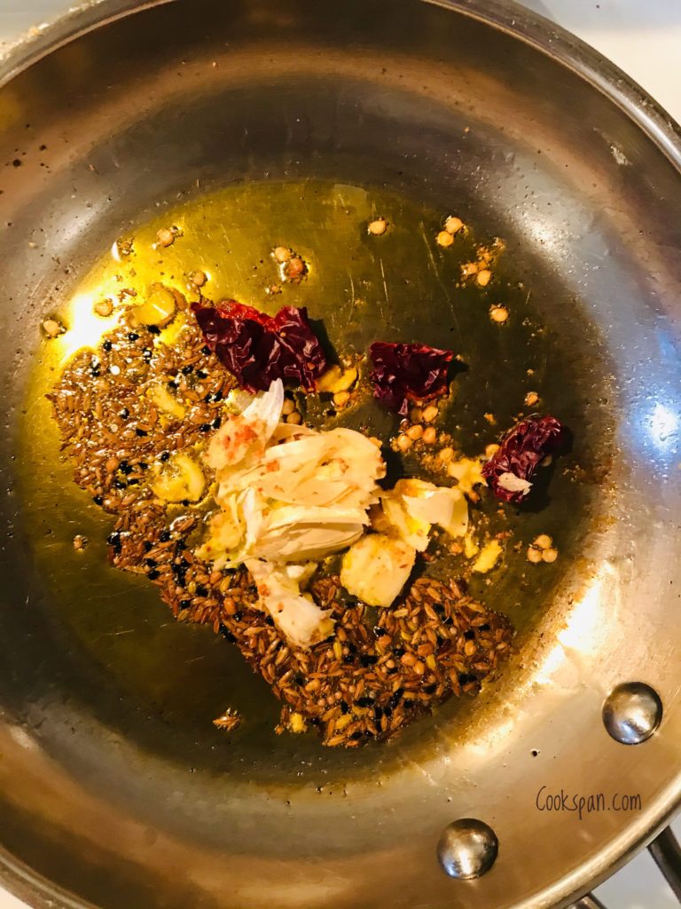 - Then to the heated oil, add the pancha phutana, red chillies. Once it crackles, add the crushed garlic.