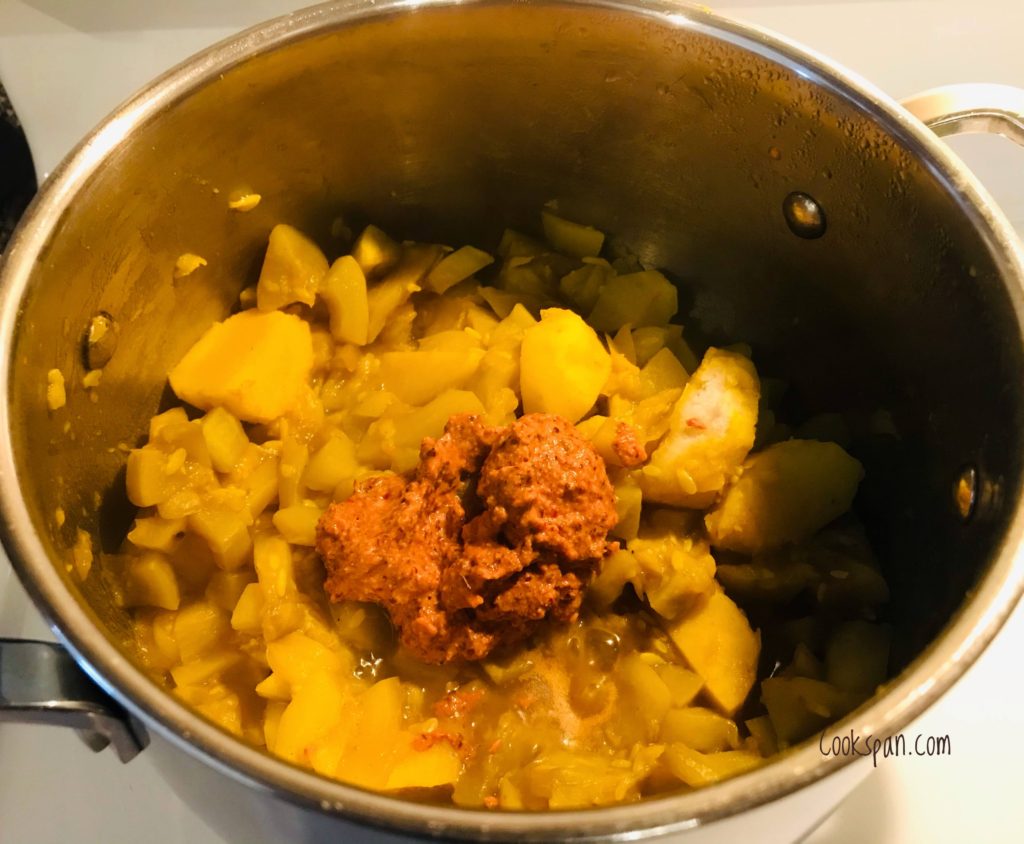 - Then, once it’s cooked, add the besara paste and cook for 15 mins (when all the veggies are cooked properly).