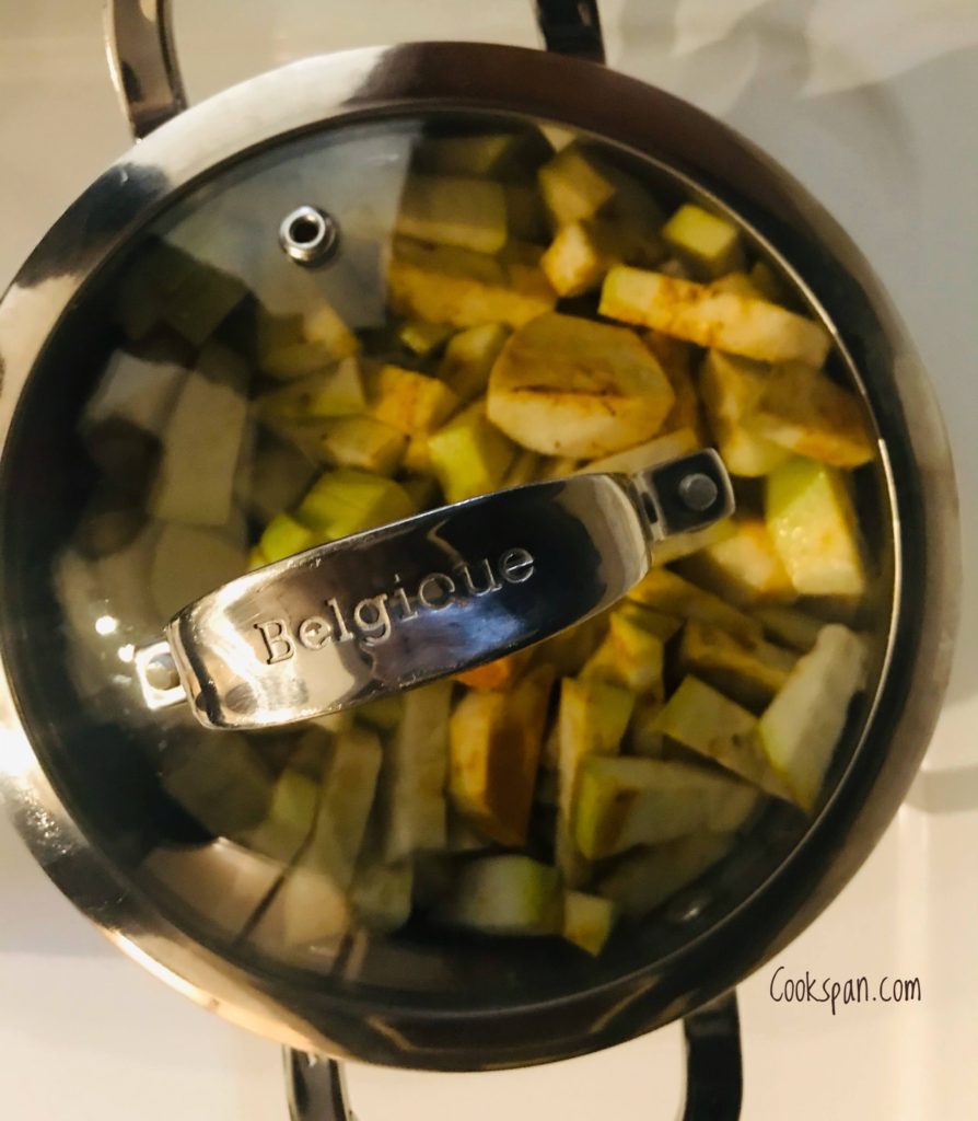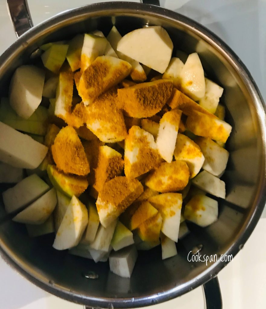 - Next, in a cooking pot, combine the cleaned vegetables, salt, and turmeric. Cook for 15 minutes, covered..