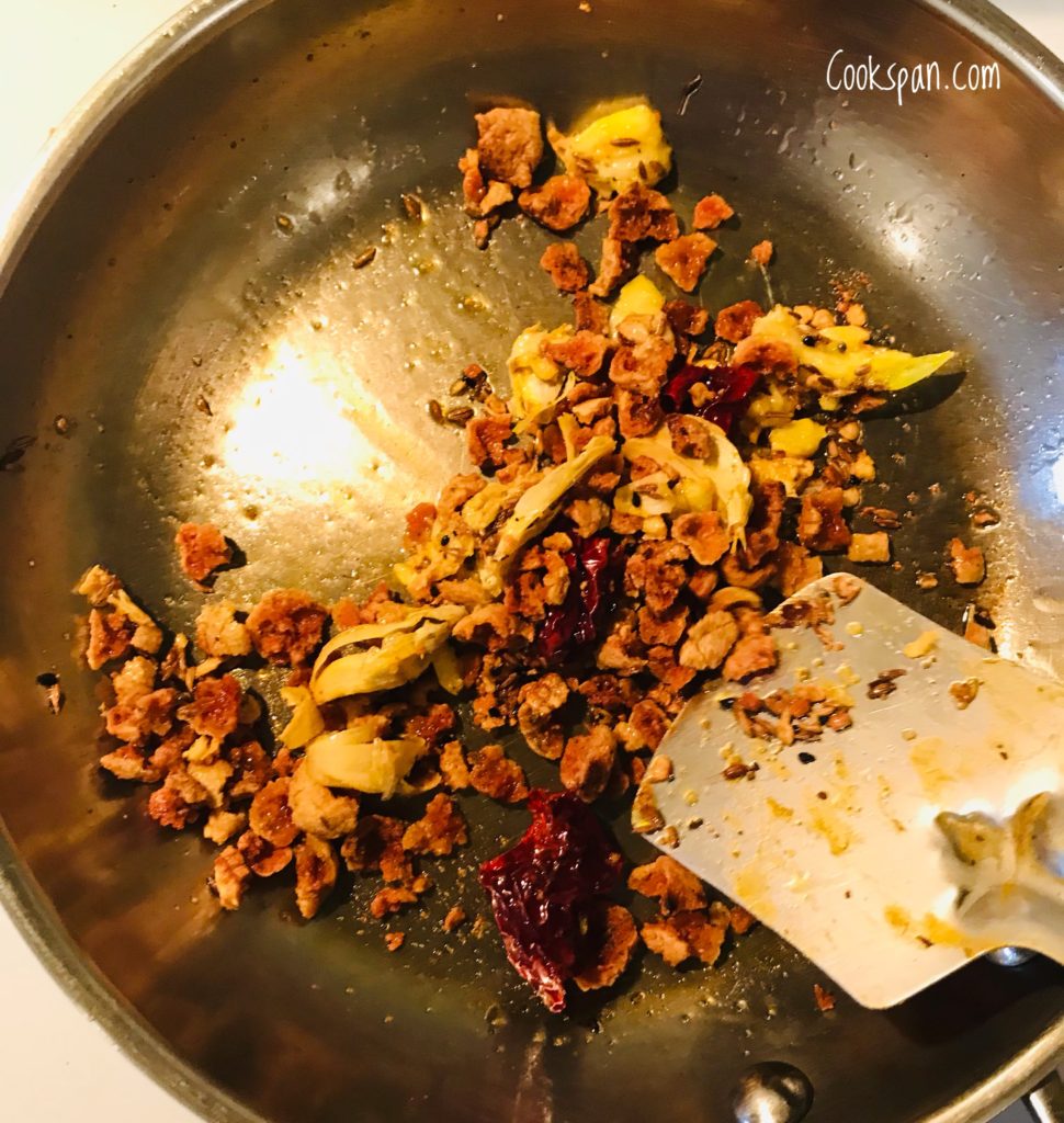 - Next, to it add the crushed Badi and saute until everything is golden brown.