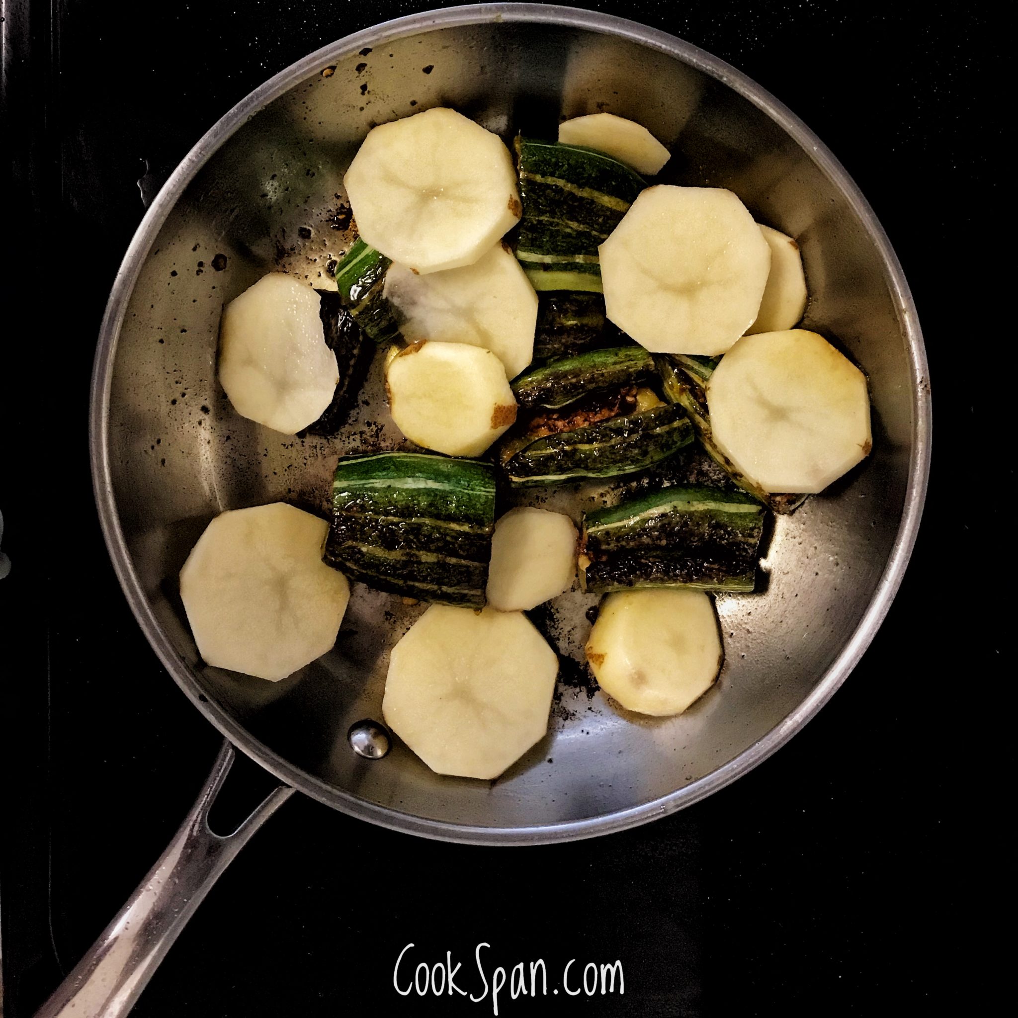 Cover and cook the stuffed snake gourd 7. Then make sure to turn the stuffed snake gourd and cook for about 2-3 mins. 8. Next add few potato cut in roundels and cook further. The reason I added potatoes is a small trick my grandma used. As the stuffed veggies have a tendency of oozing out all the stuffed spices at some point of time, these potatoes plays a medium to absorb the spices and prevents the spices from sticking to the pan and getting burnt.