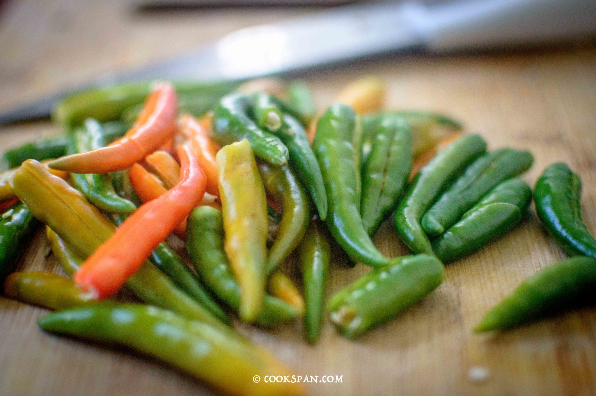 Chilies 6. Heat a pan and add 2 tbsp of mustard oil and fry the chilies till shiny, but make sure not to cook them.