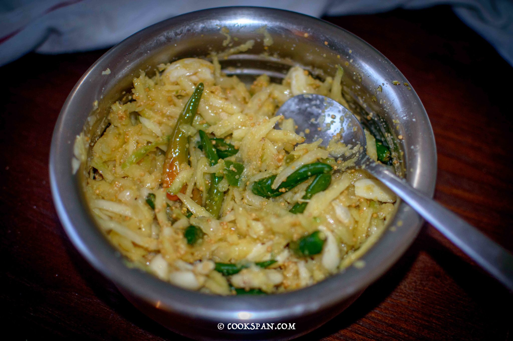 My maternal grandparents’ house is blessed with a mango orchard, which has enough variety and lovely shade to enjoy the tropical summer. The grated mango pickle she made was from the tender ones which would fall from the tree before actually ripening. Jumping of monkeys or rain showers or massive winds would make these ones fall. Generally, she used to make this pickle during Indian spring, sometime around March. Every evening she would take a tour of the orchard and collect all the tender mangoes lying on the ground and make this instant pickle. And as much as I remember, even if she made a full canister, we would consume it within a day or two.