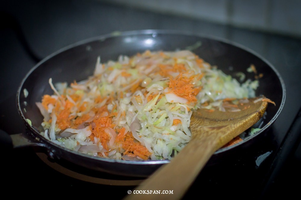 - Once the onions get translucent, add the finely chopped cabbage and cook it till the water is released from the cabbage and it gets dried up.